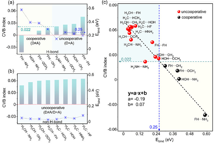 | Fig. 2. The core-valence bifurcation (CVB) index and binding energies of equilibrium structures. (a) The CVB index and binding energies of H-bonded systems. (b) The CVB index and binding energies of non-H-bonded systems. Between them, the CVB index, corresponding to the bar, is marked on the left vertical axis, and the binding energy, corresponding to the scatter, is marked on the right vertical axis. The blue dotted line indicates that the binding energy of HO-H···OCH2 is 0.25 eV, and the green dotted line denotes that the CVB index of H2N-H···NH3 is 0.022. (c) Relationship between binding energy and CVB index and corresponding linear fitting formula. The coefficient a, constant b and goodness R2 of fit are −0.19, 0.07 and 0.92 for our simulations, respectively. The values 0.25 eV and 0.022 denote the boundary of cooperative and uncooperative effects. The light yellow and blue areas in the figure represent cooperative and uncooperative effects, respectively. | |