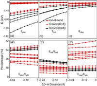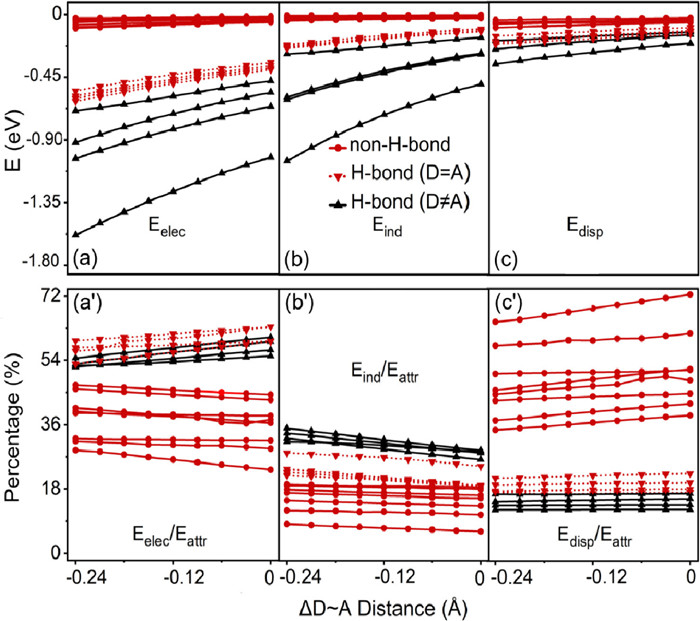 | Fig. 4. Energy decomposition analysis during the contraction of different systems. (a-c) Changes in the electrostatic Eelec, induced Eind and dispersion Edisp interaction energy as the D~A distance decreases, respectively. (aʹ-cʹ) Changes in the percentage contributions of Eelec, Eind and Edisp to attractive interaction Eattr as the D~A distance decreases, respectively. The black solid lines represent H-bonded systems with D ≠ A. The red dashed and solid lines represent H-bonded systems with D = A and non-H-bonded systems, respectively. | |