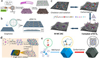 Fig. 3. Schematic illustration of preparation route to M1-Nx-Cy based SACs by the physical assistance methods of support trapping strategy: (a) Preparation of Pt/NGNs using the ALD method. Reproduced with permission [41]. Copyright 2016, Springer Nature. (b) Preparation of Co-NG-MW by the microwave-assisted method. Reproduced with permission [44]. Copyright 2018, Wiley-VCH. (c) Preparation of Pt1/NPC by the photochemical reduction method. Reproduced with permission [48]. Copyright 2018, American Chemical Society. (d) Preparation of PtSA-NT-NF by the potential-cycling method. Reproduced with permission [52]. Copyright 2017, Wiley-VCH. |