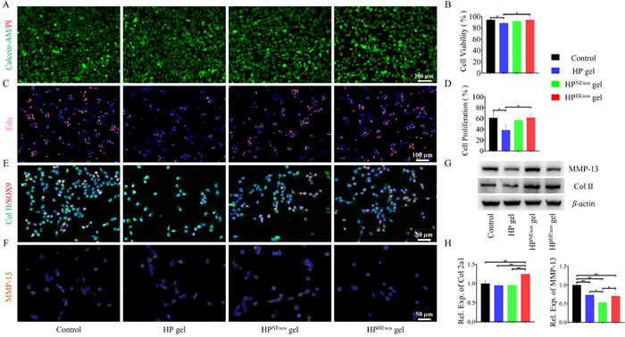 Fig. 2. Effects of NExos and HExos-loaded HP hydrogel for chondrocyte viability, proliferation and expression of related proteins. (A) The live-dead cell staining of chondrocytes, scale bar = 200 µm. (B) The cell viability of chondrocyte, one-way ANOVA, *P < 0.05. (C) The Edu staining of chondrocytes, scale bar = 100 µm. (D) The proliferation of chondrocyte, one-way ANOVA, *P < 0.05. (E, F) Representative immunofluorescence images of Col Ⅱ (green), SOX9 (red), and MMP-13 (orange), nucleus was stained with DAPI (blue), scale bars = 50 µm. (G) Western blotting of Col Ⅱ and MMP-13, β-actin was served as a loading control. (H) Relative mRNA expression of Col2a1 and MMP-13, one-way ANOVA, *P < 0.05, **P < 0.01. |