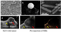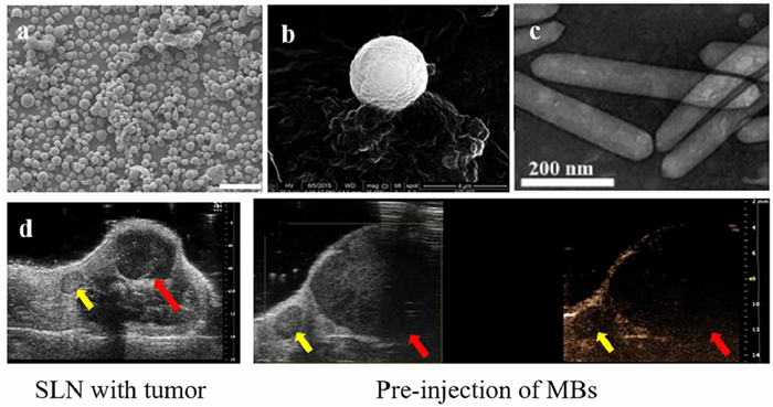 | Fig. 2. Pictures of diagnostic MBs. (a) SEM of air MBs. (Scale bar: 5 µm). Copied with permission [9]. Copyright 2022, Elsevier. (b) SEM images of C3F8 MB. Copied with permission [11]. Copyright 2018, Springer Nature. (c) TEM image of Anabaena flos-aquae derived gas vesicles. Copied with permission [17]. Copyright 2022, Elsevier. (d) CEUS imaging of orthotopic breast tumor and the sentinel lymph node in mice. Copied with permission [20]. Copyright 2021, Springer Nature. | |