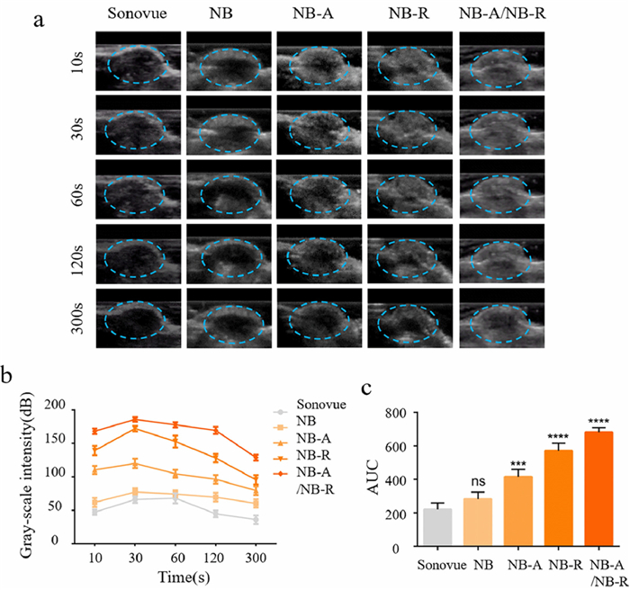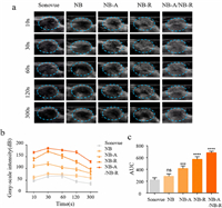 | Fig. 3. Ultrasound imaging of tumor after injection of biotinylated ligand MBs. (a) Grayscale ultrasound imaging of tumor after injection of SonoVue MB, NB, NB-A, NB-R and NB-A/NB-R at various time points (10, 30, 60, 120 and 300 s). (b, c) Corresponding time-intensity curves and AUC analysis with data extracted from (a). The data represent the mean ± S.E.M. (n = 3 per group). A one-way ANOVA test was used for statistical analysis; ns: no significance, ***P < 0.001, ****P < 0.0001 compared with the Sonovue group. Copied with permission [65]. Copyright 2021, Elsevier. | |
