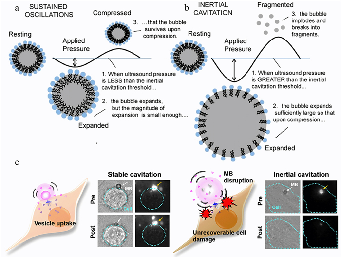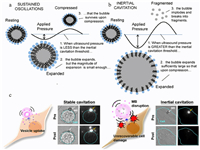 | Fig. 4. MB cavitation. (a) Schematic of stable cavitation. Copied with permission [80]. Copyright 2003, Ivyspring International. (b) Schematic of inertial cavitation. Copied with permission [80]. Copyright 2003, Ivyspring International. (c) Impact of cavitation on cells. Copied with permission [84]. Copyright 2021, Elsevier. | |