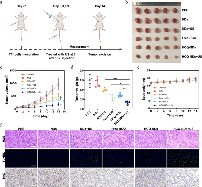 | Fig. 5. US and MB enhance tumor inhibition in vivo. (a) Schematic illustration of the experiment. (b) Photographs of excised tumors at the experiment terminal. (c) The tumor growth curves of different groups in 14 days. (d) The weight of excised tumor in different groups. (e) Body weight changes of mice after different treatments. (f) HE staining, TUNEL and IHC analysis in different groups. Scale bar: 100 µm. All statistical data are expressed as means ± SD (n = 5). Copied with permission [101]. Copyright 2022, Elsevier. | |
