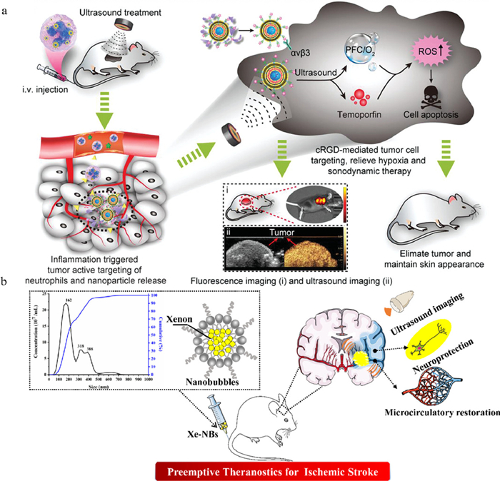 | Fig. 6. Schematic of the effects of theranostic MBs. (a) Schematic of the MB combining SDT, fluorescence imaging and US imaging. Copied with permission [96]. Copyright 2022, John Wiley and Sons. (b) Schematic of the imaging and treating utilities of Xe-NBs. Copied with permission [130]. Copyright 2018, American Chemical Society. | |