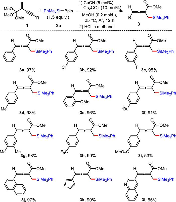 Initially, the 1,4-protosilylation reaction was tested with using enynic orthoester 1a and PhMe2Si-Bpin 2a as model substrates (Table 1). The choice of base had a significant impact on yield. The organic base such as Et3N or DMAP, only afforded trace amount of product 3a with using 5 mol% CuBr as catalyst (entries 1 and 2). It is worth noting that the yield of 3a could be enhanced to 40% when the reaction was performed in the presence of Cs2CO3 (entry 3). After screening different copper catalysts, it was found that the yield of 3a could be increased to 97% when the 1,4-protosilylation reaction was catalyzed by CuCN (entries 3–5). These results indicates that good acid-base ion pair matching of CuCN may be the reason for its high catalytic activity in this reaction [55]. To our delight, under above-mentioned optimal conditions (entry 5), the corresponding homoallenylboronate 4a was obtained in 95% isolated yield (entry 6).