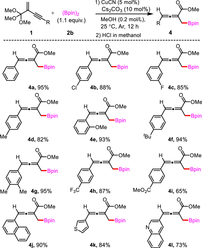 | Scheme 3. Substrate scope of 1,4-protoborylation-hydrolyzation of enynic orthoesters. Unless otherwise noted, reaction was run under the following reaction condition: 1a (0.2 mmol), 2b (0.22 mmol), CuCN (5 mol%), Cs2CO3 (10 mol%) in 1.0 mL anhydrous MeOH at 25 ℃ for 12 h under argon atmosphere. Isolated yield. | |