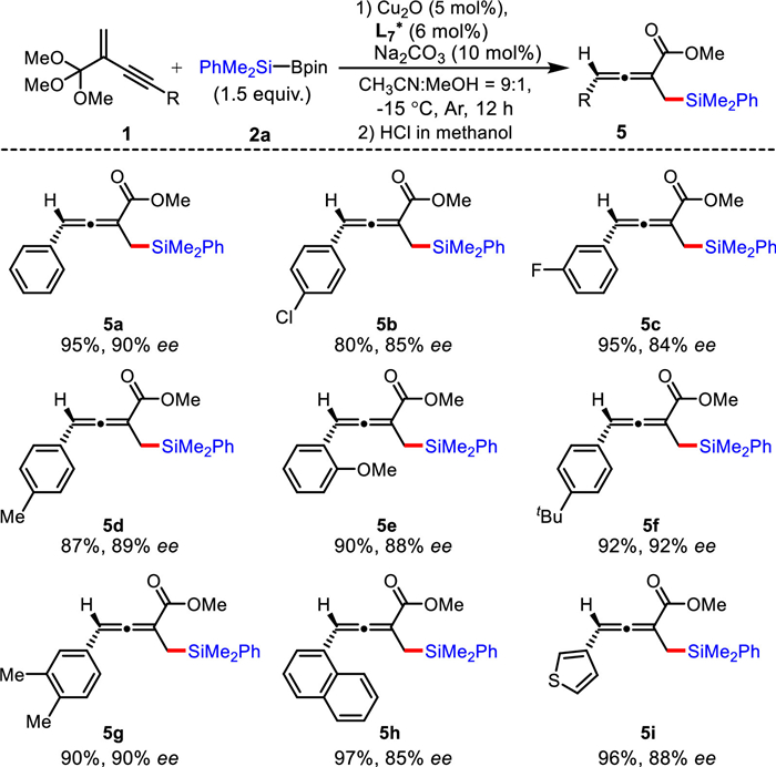 Subsequently, we examined the substrate compatibility of the asymmetric 1,4-protosilylation-hydrolyzation of enynic orthoesters (Scheme 4). In general, the enynic orthoesters with electron-donating goups (Me, OMe, tBu, 3, 4–Me2) on the phenyl ring were suitable substrates and gave the corresponding products in high yields and with good enantioselectivities. Similarly, the products containing halogen atoms on the phenyl ring were also obtained in good yields and with slightly lower ee values (5b, 5c). Moreover, 1-naphthyl and 3-thienyl substituted enynic orthoester substrates could react smoothly under the optimal conditions and furnished the corresponding chiral homoallenylsilanes in high yields and with good ee values (5h, 5i).