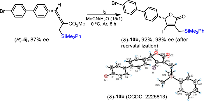| Scheme 6. Iodolactonization of the 2, 3-allenoate (R)−5j. | |