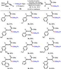 | Scheme 4. Substrate scope of asymmetric 1,4-protosilylation-hydrolyzation of enynic orthoesters. Unless otherwise noted, the reaction was run under the following condition: 1a (0.2 mmol), 2a (0.3 mmol), Cu2O (5 mol%), Na2CO3 (10 mol%), L7 (6 mol%) and 4 Å molecular sieves (0.0250 g) were stirred in 1.0 mL anhydrous CH3CN/MeOH (9:1) at −15 ℃ for 12 h under argon atmosphere. Isolated yield and the ee was determined by HPLC. | |