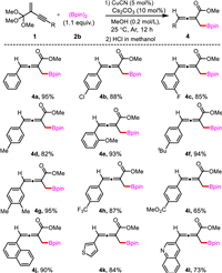 Having established the conditions for the racemic 1,4-protosilylation of enynic orthoesters, the substrate scope of enynic orthoesters was investigated (Scheme 2). Generally, different aryl-substituted substrates were compatible in this reaction. The results indicated that the substrates with electron-donating or electron-withdrawing group on phenyl ring all could provide the desired products in good yields. Additionally, other enynic orthoesters bearing naphthyl (1j), thienyl (1k) or halogen-substituted phenyl ring (1b, 1c) also could be well tolerated in this reaction. When the quinolone-substituted substrate 1l was applied to the reaction, the product 3l was formed only in moderate yield. Furthermore, we tried the racemic 1,4-protoborylation and hydrolyzation of different enynic orthoesters with bis(pinacolato)diboron 2b (Scheme 3). Similarly, the enynic orthoesters above could afford the corresponding 1,4-protoborylation products in moderate to high yields under the optimized reaction conditions.