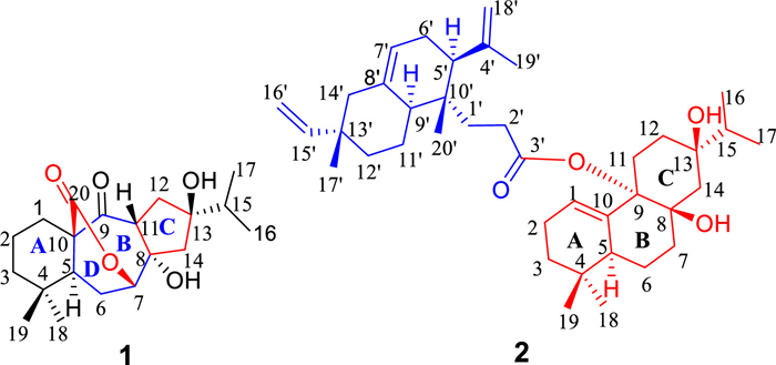 As a continuous part of the project to discover novel active compounds from I. flavidus, two novel diterpenoids (1 and 2) have been isolated from the twigs and leaves of this plant (Fig. 1). Compound 1 represents an unprecedented diterpenoid with a novel six/seven/five-membered carbon skeleton, and compound 2 is a heterodimeric diterpenoid belonging to a seco-isopimarane coupled with a norabietane unit featuring an unique ester linkage between C-9 and C-3′. The compounds have been evaluated for their antiinflammatory activities based on the inhibitory assays of nitric oxide (NO) production and tumor necrosis factor-α (TNF-α) expression in lipopolysaccharide (LPS)-induced RAW264.7 cells.