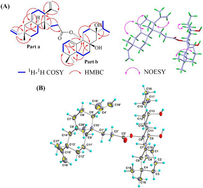 Compound 2 was obtained as colorless crystals. Its molecular formula of C39H60O4 was deduced from the HR-ESI-MS (m/z 615.4379 [M+Na]+, calcd for C39H60O4Na, 615.4384). The IR spectral data indicated the presence of hydroxyl (3324 cm−1) and ester carbonyl (1745 cm−1) groups in 2. The 1H NMR spectrum (Table 1) coupled with the analysis of the 1H–1H COSY spectral data (Fig. 3A) exhibited the characteristic proton signals for five singlet methyls (δH 0.81, 0.87, 0.88, 0.92, 1.82), two olefinic protons from their corresponding trisubstituted double bond counterparts [(δH 5.37 (d), 5.77 (t)], three olefinic protons from a vinyl group [(δH 4.88 (d), 4.94 (d), 5.81 (dd)], two olefinic protons from a methylene group [(δH 4.80 (d), 4.87 (d)], and seven aliphatic protons from an isopropyl group [(δH 0.92 (dd, 3H); 0.93 (dd, 3H); 1.58 (m, 1H)]. The 13C NMR and DEPT spectra (Table 1) revealed that 2 contains 39 carbon signals, which consist of one ester carbonyl carbon (δC 171.6), eight olefinic carbons (δC 114.1, 109.5, 121.5, 123.6, 136.1, 138.7, 147.5, 150.2), three aliphatic oxyquaternary carbons (δC 73.8, 74.8, 84.5), seven methyl carbons (δC 16.9 × 2, 17.1, 21.6, 23.7, 27.2, 28.1), thirteen methylene carbons (δC 20.7, 21.0, 23.1, 25.1, 29.3, 29.8, 30.3, 31.0, 32.9, 34.8, 36.3, 38.9, 46.5), four methine carbons (δC 38.8, 43.2, 44.4, 49.7), and three aliphatic quaternary carbons (δC 30.9, 37.1, 37.6). The aforementioned structure information indicated 2 as a diterpenoid dimer, which could comprise an isopimarane unit (part a, Fig. 3A), and a norabietane unit (part b, Fig. 3A) due to the presence of the characteristics vinyl and isopropyl groups.