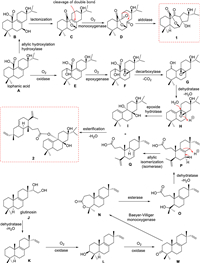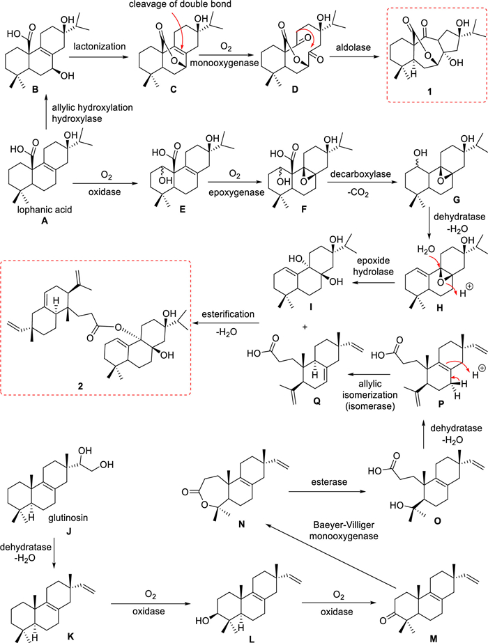 For 2, the abietane diterpenoid unit could also be derived from lophanic acid (A). A undergoes an oxidation to introduce a hydroxyl group of C-1 to produce E, which could be converted to F by epoxidation of the Δ8, 9 double bond. The C-20 carboxylic acid could be cleaved off via a decarboxylation mechanism to afford G, which loses a H2O molecule to form H. The hydrolysis of the exposide could thus produce the norditerpene unit of 2. The seco-isopimarane diterpenoid unit of 2 was proposed to be derived from glutinosin, a constituent richly found in I. flavidus [15]. The dehydration of the two hydroxyl groups in glutinosin (J) forms compound K, which is added a hydroxyl on C-3 to produce L [8(9), 15-isopimaradien-3β-ol from Platycladus orientalis] [16] by an oxidation reaction. Another oxidation further transforms L to M, which undertakes a Baeyer-Villiger reaction to yield N with a 7-membered lactone ring [17]. The hydrolysis of N opens the lactone ring to provide O, which loses the hydroxyl group to form a double bond between C-4′ and C-18′ for P by the dehydration. The other diterpene monomer unit Q [3, 4-secoisopimara-4(18), 7, 15-triene-3-oic acid from Salvia cinnabarina] [18] is thus produced from P via an allylic isomerization to shift the Δ8, 9 double bond to Δ7, 8. An esterification reaction then occurs between the two diterpene monomers of I and Q to accomplish the final step of the biosynthetic pathway of compound 2.
