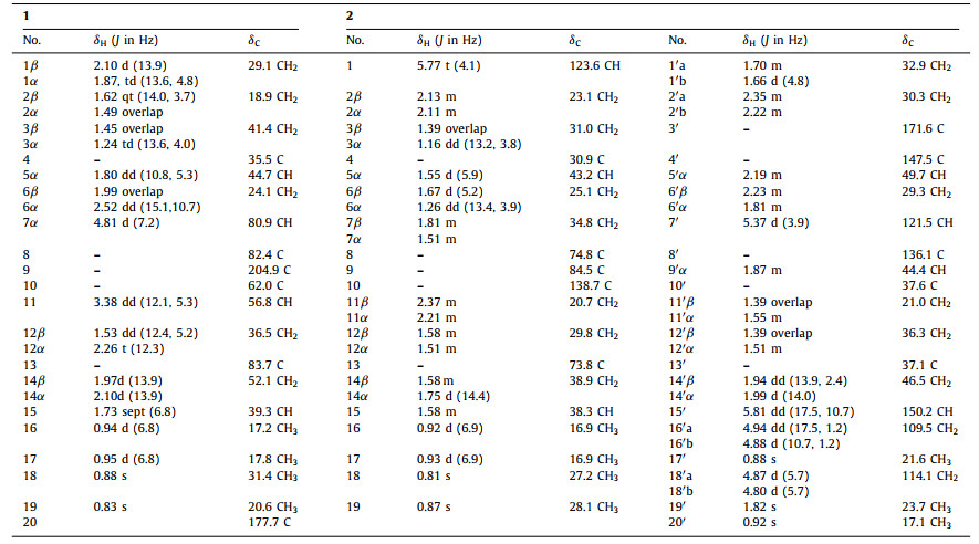 Compound 1, colorless crystals, was deduced to have the molecular formula of C20H30O5 from its high resolution electrospray ionization mass spectrometry (HR-ESI-MS) (m/z 373.1985 [M+Na]+, calcd. for 373.1991), which is calculated to have 6 unsaturated degrees. The infrared (IR) spectrum displayed absorption bands at 3474 cm−1 belonging to hydroxy groups and 1730 and 1702 cm−1 belonging to carbonyl groups. The 13C nuclear magnetic resonance (NMR), distortionless enhancement by polarization transfer (DEPT)-135° and DEPT-90° spectra of 1 (Table 1) exhibited 20 carbon signals, characterizing as four methyl carbons, six aliphatic methylene carbons, one oxymethine carbon, three non-oxymethine carbons, one ketone carbonyl carbon, one carboxylic carbon, and four aliphatic quaternary carbons including two oxygenated ones.