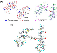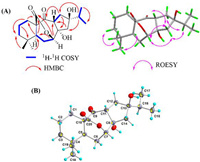 | Fig. 3. 2D NMR correlations and X-ray data of 2. (A) Key 2D NMR correlations of 2. (B) Plot of X-ray crystallographic data for 2 (Displacement ellipsoids are drawn at the 30% probability level). | |
