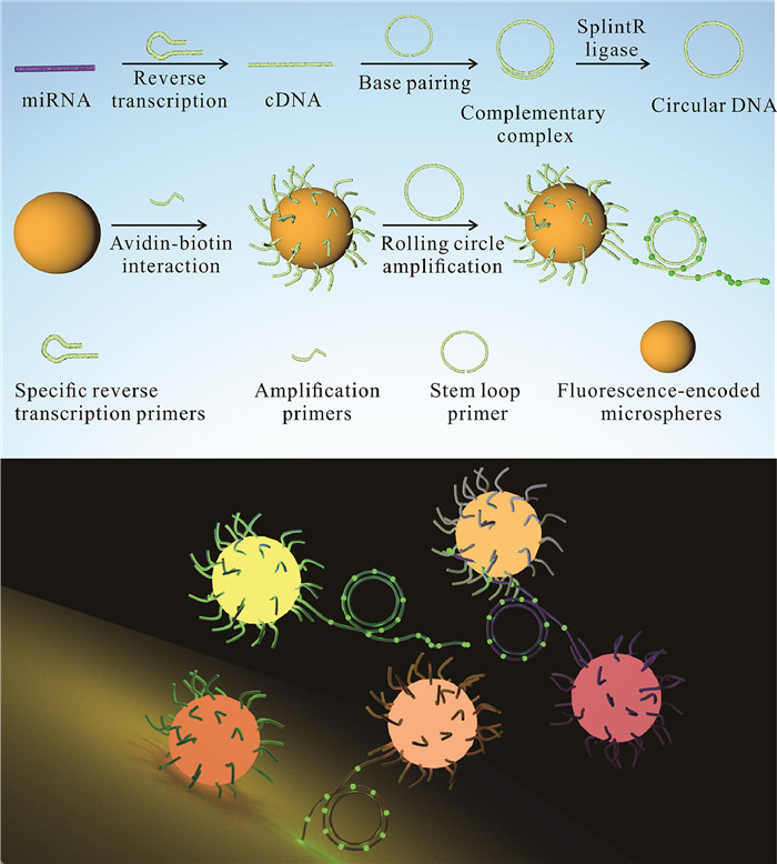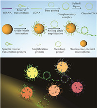 | Fig. 1. Schematic illustration of the mechanism of high-throughput quantitative detection of TNBC-associated expressed miRNAs by RCA on fluorescence-encoded microspheres. | |