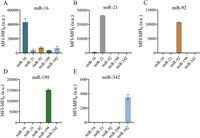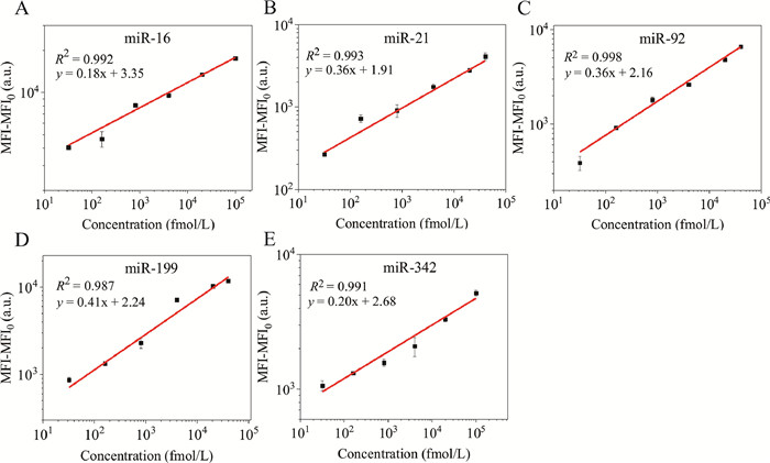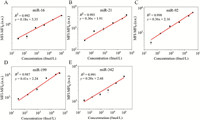 | Fig. 3. The linear relationship of (A) miR-16, (B) miR-21, (C) miR-92, (D) miR-199, and (E) miR-342 between mean fluorescence intensity and miRNA concentration. | |