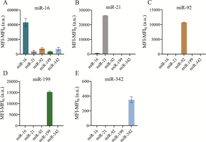 Moreover, the specificity of the method was investigated. As illustrated in Fig. 4, only in the presence of a specific target miRNA, the fluorescent signal on the corresponding encoded microsphere significantly increases. The fluorescence signal on other non-corresponding encoded microspheres is almost negligible. For example, when there is only target miR-21 in the test, the fluorescence intensity detected on the corresponding microsphere is at least 53 times that of other microspheres (Fig. 4B). Furthermore, almost no interfering signal is observed when miR-92, miR-199, and miR-342 are individually tested for specificity as analytes, meaning that no non-specific amplification occurs (Figs. 4C-E). Among the specific detections, the specific detection of miR-16 is the least satisfactory, but its fluorescence intensity on the corresponding encoded microspheres is also at least 6-fold higher than the interference signal (Fig. 4A). According to these results, it can be seen that this method has reasonable specificity, and the cross-linking signal of these five miRNAs is relatively tiny.