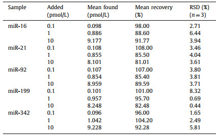 Table 1 Recovery data for different concentrations of miR-16, miR-21, miR-92, miR-199, and miR-342 spiked into serum samples. |