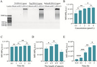 | Fig. 2. Optimization of experimental conditions. (A) Agarose gel electrophoresis of RCA products after ligation by T4 DNA ligase, Taq DNA ligase, and SplintR ligase, respectively. (B) Fluorescence intensities of different concentrations of test primers attached to fluorescence-encoded microspheres for 2 h detected by flow cytometry. (C) Fluorescence intensities of the test primers on fluorescence-encoded microspheres after mixing with the microspheres for different times. (D) Fluorescence intensities of amplification products after RCA reaction with amplification primers with different arm lengths. (E) Fluorescence intensities of amplification products for different times of RCA. ns: not significant, *P < 0.05, **P < 0.01, ***P < 0.001 and ****P < 0.0001. | |