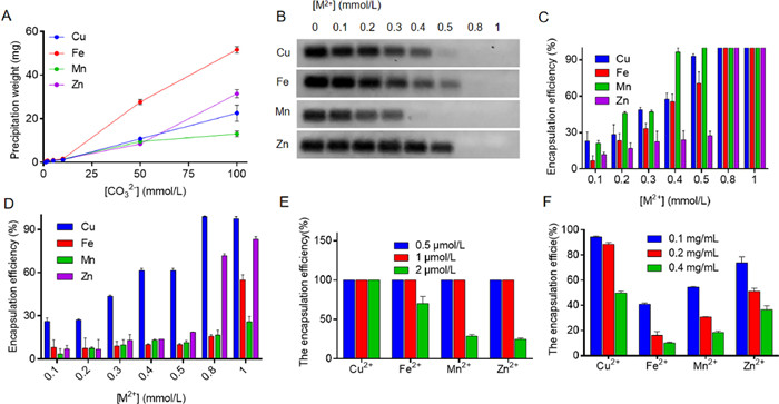 | Fig. 1. (A) The quantification of the precipitant weights showing interaction between transition metals and various concentrations of CO32−. (B) The PAGE gel images showing the unloaded DNA at various metals concentrations for biomineralization, and (C) the quantification of DNA loading from B. (D) The loading efficiency of BSA at various metals concentrations for biomineralization. The biomineralization of the transition metals for various concentrations of (E) DZ and (F) GOx loading. | |