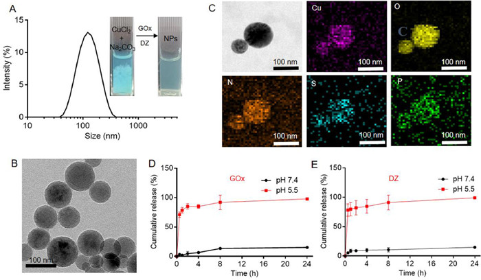 | Fig. 2. (A) The dynamic size of GOx/DZ@Cu NPs. Inset: The appearance of the solutions before and after GOx/DZ loading to show the stabilization effect of the macromolecules. (B) TEM and (C) elemental mapping images of the nanoparticles. The pH-responsive release of (D) GOx and (E) DZ. | |