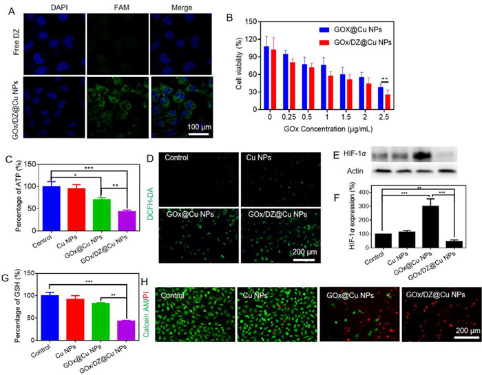 | Fig. 3. (A) Fluorescent images showing the uptake of free DZ and GOx/DZ@Cu NPs. (B) The cell cytotoxicity of GOx@Cu and GOx/DZ@Cu NPs. (C) The relative intracellular ATP level after various treatments. (D) The DCFH-DA fluorescence to probe the intracellular ROS generation after various treatments. (E) HIF-1α protein expression after various treatments, and (F) the protein level quantification. (G) The relative intracellular GSH level after various treatments. (H) Fluorescent image of live/dead cell staining to show the anti-tumor activity of various formulations. | |