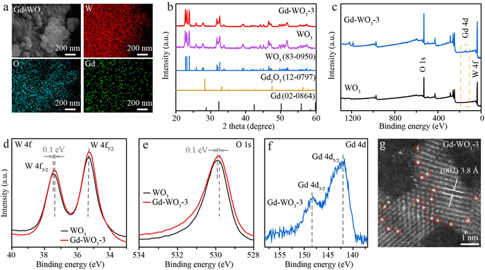| Fig. 1. (a) Low-resolution SEM image and the corresponding element mappings of Gd-WO3–3. (b) The XRD patterns of WO3 and Gd-WO3. (c) The total survey XPS spectra of WO3 and Gd-WO3–3. (d-f) The respective W 4f, O 1s and Gd 4d XPS spectra of WO3 and Gd-WO3–3. (g) The HAADF-STEM image of Gd-WO3–3. | |