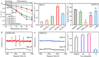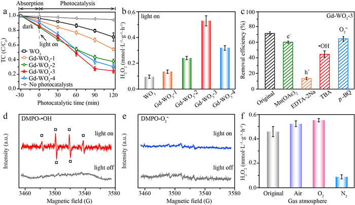 | Fig. 2. (a) Photocatalytic degradation curves of tetracycline over WO3 and series Gd-WO3 photocatalysts under dark adsorption equilibrium and simulated solar light irradiation (1 kW/m2). (b) The detected photocatalytic production of H2O2 in the presence of tetracycline under simulated solar light irradiation (1 kW/m2). (c) Effects of various quenching agents on tetracycline degradation with Gd-WO3–3. (d) ESR spectra of DMPO-•OH adduct and (e) DMPO-O2•− adduct with Gd-WO3–3 under irradiation. (f) The detected photocatalytic production of H2O2 with Gd-WO3, under purging the solution with different gas bubbles. | |
