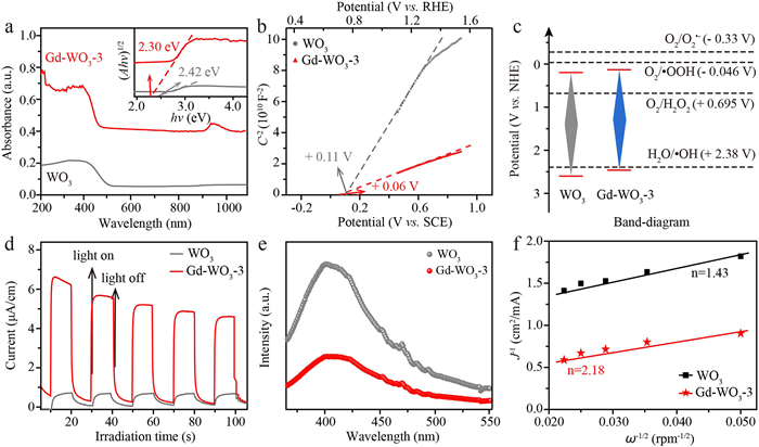 | Fig. 3. (a) UV–vis-NIR diffuse reflectance spectra of WO3 and Gd-WO3–3. The inset are plots of (Ahν)1/2 versus hν. (b) Mott-Schottky plots of WO3 and Gd-WO3–3. (c) Energy level diagrams of WO3 and Gd-WO3–3. (d) The detected photocurrent response curves of WO3 and Gd-WO3–3, with or without one solar irradiation (1 kW/m2). (e) PL spectra of WO3 and Gd-WO3–3. (f) Koutecky-Levich plots of the data obtained at the constant electrode potential (−0.35 V vs. RHE) for WO3 and Gd-WO3–3. | |