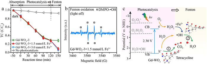 Along with the photocatalytic degradation of tetracycline, the degradation efficiency decreased gradually and closed to end at reaction time of 120 min. However, with the addition of certain amount of FeSO4 (1.5 mmol/L), degradation of tetracycline was boosted again and reached a completed removal after half an hour, and the determined k was 61.1 × 10−3 min−1 with Gd-WO3 (Fig. 5a, Fig. S13 and Table S5 in Supporting information). A continued increasement of Fe2+ dosage (3.0 mmol/L) didn't result in a further increased efficiency. This phenomenon can be attributed to the activation of H2O2 by Fe2+ to generate extra •OH, followed by a subsequent oxidation of tetracycline by •OH. The ESR analysis of this step helped to confirm the existence of •OH during this step (Fig. 5b). The photocatalytic oxidation and subsequent Fenton reaction can serve together as a cascade reaction for the efficient degradation of tetracycline. And the total organic carbon (TOC) removal efficiency through the cascade reaction was around 1.65 times higher than the sole photocatalysis (Fig. S14 in Supporting information).