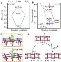 | Fig. 4. (a) Comparison of ΔG*OOH for oxygen reduction to H2O2 on WO3 and Gd-WO3. (b) Free energy diagram for the 2e− pathway for H2O2 generation on WO3 and Gd-WO3 at U = 0 V vs. RHE. Differential charge densities of (c) WO3 and Gd-WO3 after *OOH adsorption. Yellow and blue-colored isosurfaces show electrons gain and loss, respectively. (d) Schematic of the 2e− pathway for H2O2 generation on Gd-WO3. | |