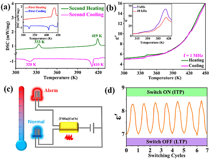 | Fig. 1. (a) The DSC curve of [TMIm][CuCl4] measured in second heating-cooling cycle. Inset: the DSC curve of [TMIm][CuCl4] measured in first heating-cooling cycle. (b) The temperature-dependence ε' of [TMIm][CuCl4] at 1 MHz in the heating and cooling cycle. Inset: the ε' of [TMIm][CuCl4] at 5 kHz and 10 kHz in the heating. (c) Working concept diagram of smart device in [TMIm][CuCl4]. (d) The switching cycles of the dielectric measurement for [TMIm][CuCl4]. | |