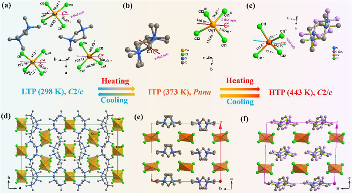 To deeply study the mechanism of microstructural change, the single crystal of [TMIm][CuCl4] was measured with variable-temperature X-ray diffraction. In the initial heating stage, [TMIm][CuCl4] crystallizes in orthorhombic space group Pna21 (point group mm2) at 298 K and 373 K, respectively (Table S1 and Fig. S4 in Supporting information). When the temperature exceeds Tc2, [TMIm][CuCl4] crystallizes in monoclinic space group C2/c (point group 2/m) with unit cell parameters of a =14.4227(18) Å, b = 7.8394(10) Å, c = 12.5370(19) Å, β = 92.499°, V = 1416.84(3) Å3, Z = 4. When the temperature returns to 298 K again (RTP), [TMIm][CuCl4] crystallizes in the monoclinic space group C2/c (point group 2/m) with unit cell parameters of a = 28.8796(14) Å, b = 15.5745(6) Å, c = 12.1945(6) Å, β = 91.236°, V = 5483.6(4) Å3, Z = 8. The relationship with the HTP cell parameters is: aRTP ≈ 2aHTP, bRTP ≈ 2bHTP, cRTP ≈ cHTP. When heated to 373 K (ITP) for the second time, [TMIm][CuCl4] crystallizes in the orthorhombic space group Pnna (point group, mmm) with unit cell parameters of a = 12.2483(6) Å, b = 14.5106(6) Å, c = 7.8439(4) Å, V = 1394.10(11) Å3, Z = 4. Entering the high-temperature phase again, [TMIm][CuCl4] still crystallizes in the C2/c space group, and the unit cell parameters are consistent with the previous HTP. This exactly matches with the results of the DSC test.