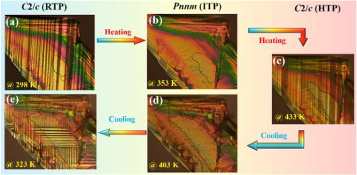 | Fig. 3. (a-e) The evolution of ferroelastic domains for [TMIm][CuCl4] in heating and cooling cycle. | |