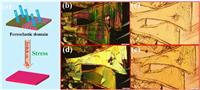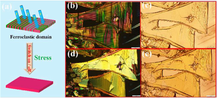 | Fig. 4. (a) Schematic diagram of ferroelastic domain switching under stress. (b, d) Evolution of the ferroelastic domains in [TMIm][CuCl4] under external stress stimuli observed by orthogonally polarized light microscopy. (c, e) The topography images of [TMIm][CuCl4] for the corresponding region in (b) and (d), respectively. | |