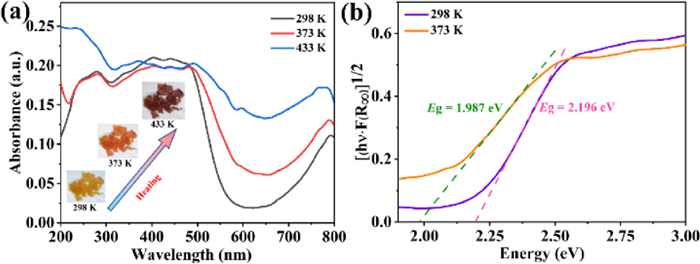 | Fig. 5. (a) Variable-temperature solid-state UV-vis absorption spectra are recorded at 298 K, 373 K and 433 K. (b) The extrapolated optical band gaps for 298 K and 373 K. | |