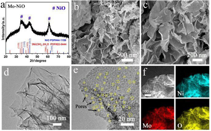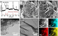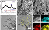 | Fig. 2. (a) XRD pattern, (b, c) typical SEM images, (d, e) TEM images, (f) STEM and corresponding EDS elemental mapping images of Mo-NiO. | |