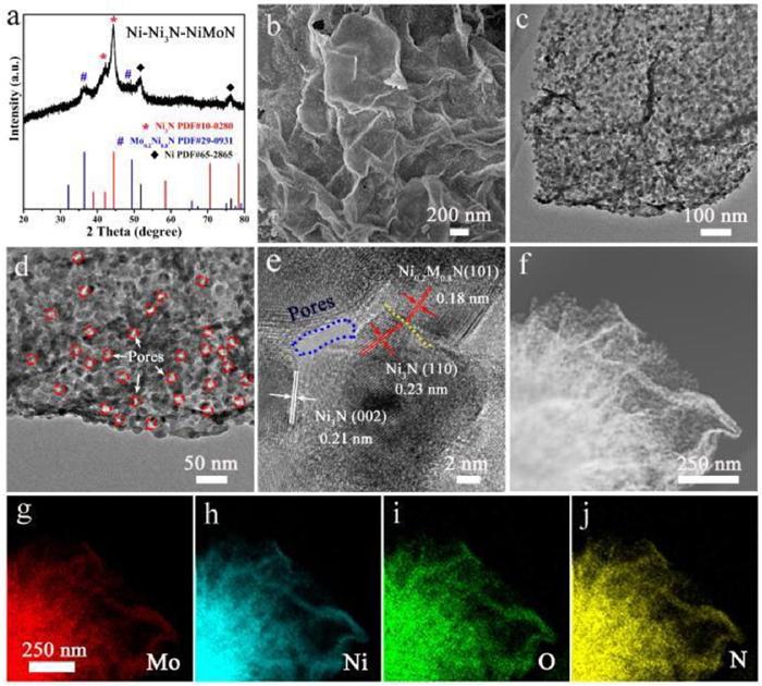 | Fig. 3. (a) XRD pattern, (b) typical SEM images, (c–e) TEM images, (f–j) STEM and corresponding EDS elemental mapping images of Ni-Ni3N-NiMoN. | |