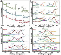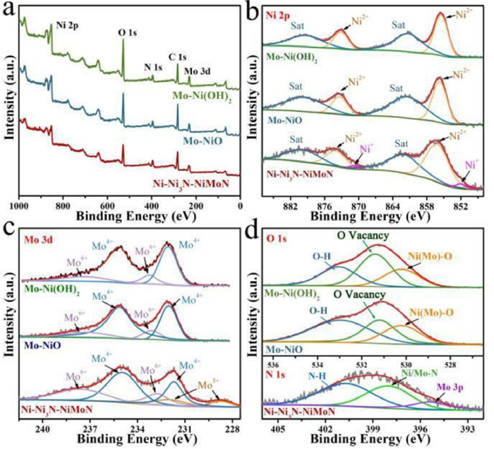| Fig. 4. XPS spectra of the Mo-Ni(OH)2 precursors, Mo-NiO, and Ni-Ni3N-NiMoN: (a) Wide scan spectrum and the high-resolution spectra of (b) Ni 2p, (c) Mo 3d, (d) O 1s and N 1s-Mo 3p. | |