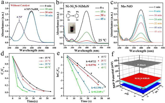 | Fig. 5. (a) The UV-vis absorption spectra of 4-NP solution with and without NaBH4. (b) Change in the absorbance of solution at 400 nm in the presence of NaBH4. (c) UV-vis absorbance spectra for the reduction of 4-NP in the presence of the Mo-NiO catalyst; Plots of (d) Ct/C0 and (e) ln(Ct/C0) vs. time at different temperature. (f) Work function comparison of Pt black, Ni-Ni3N-NiMoN, MoO2 and Ni. | |