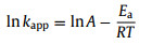 where kapp and R are the reaction rate constant and the molar gas constant (8.314 J K-1 mol-1) at the reaction temperature T. Ea and A are the apparent activation energy and pre-exponential factor. The activation energy shows the effect of temperature on the catalytic performance.