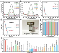 | Fig. 6. UV-vis absorption spectra of 4-NP solution at different contact time with (a) Mo-Ni-375 and (b) Mo-Ni-450. Plots of (c) Ct/C0 and (d) ln(Ct/C0) against contact time for the reduction of 4-NP reactions catalyzed by Mo-Ni-375, Ni-Ni3N-NiMoN (Mo-Ni-400) and Mo-Ni-450. (e) The magnetic property of Ni-Ni3N-NiMoN. (f) The reusability of Ni-Ni3N-NiMoN. (g) The comparison of catalytic performance of Ni-Ni3N-NiMoN with recently reported catalysts. | |