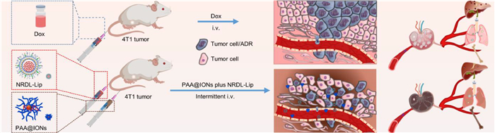 | Fig. 1. PAA@IONs and NRDL-Lip targeting tumors and the microenvironment simultaneously (Schematic). This strategy can achieve chemo–immunotherapy for TNBC chemo-resistance and multiorgan-specific metastases by remodeling the immunosuppressive microenvironment. | |