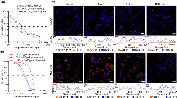 | Fig. 3. Reversal of multidrug resistance. (a) In vitro cytotoxicity of free Dox, DL-Lip, and NRDL-Lip against MCF-7 cells. (b) Enhanced in vitro cytotoxicity of co-delivered liposomes in MCF-7/ADR cells. Data are the mean ± SD (n=6). (c) CLSM showing P-gp expression in MCF-7/ADR and MCF-7 cells incubated with free Dox, DL-Lip, or NRDL-Lip at an equivalent Dox concentration of 500ng/mL. Scale bar: 50µm. Blue fluorescence showed the localization of cell nucleus. Red fluorescence showed P-gp expression. Blue: propidium iodide (PI), stained cell nucleus. Red: phycoerythrin (PE)-labeled anti-P glycoprotein. | |