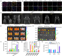 | Fig. 2. In vitro and in vivo evaluation of the efficacy of NRDL-Lip and PAA@IONs dual-targeting. (a) Confocal laser scanning microscopy showing uptake in M2-TAMs and M1-TAMs treated with phosphate-buffered saline (PBS) (blank), FITC-DL-Lip, FITC-NRDL-Lip, and FITC-NRDL-Lip+mannose. 4′, 6-Diamidino-2-phenylindole (DAPI) showing blue fluorescence, and wheat germ agglutinin (WGA) showing red fluorescence, FITC showing green fluorescene. Scale bar: 20µm. (b) Confocal laser scanning microscopy showing uptake in MCF-7 (CD206−/CD13+) and MDA-MB-231 (CD206+/CD13−) breast cancer cells. Scale bar: 20µm. (c) In vivo MRI images in the tumor region, bone and lymph node of mice after intravenous injection of PAA@IONs at 24h. (d) In vivo biodistribution assay of different DiR-labeled liposomes in 4T1 tumor-bearing mice. (e) Ex vivo fluorescence imaging of tumors and organs. (f) Quantitative uptake of different formulations in tumor cells (MDA-MB-231) after incubation for 3h at a Dox concentration of 10µg/mL. (g) Tissue distribution of PAA@IONs as determined by ICP-MS 24h post-injection. (h) Mean radiant efficiency of tumors and main organs 24h after intravenous injection (n=3). *P < 0.05, **P < 0.01, ***P < 0.001, ****P < 0.0001. Data are the mean ± standard deviation (SD) (n=3). FITC-DL-Lip/DiR-DL-Lip: FITC/DiR fluorescence labeled DL-Lip; FITC-NRDL-Lip: FITC fluorescence-labeled NRDL-Lip; ns: not significant. | |