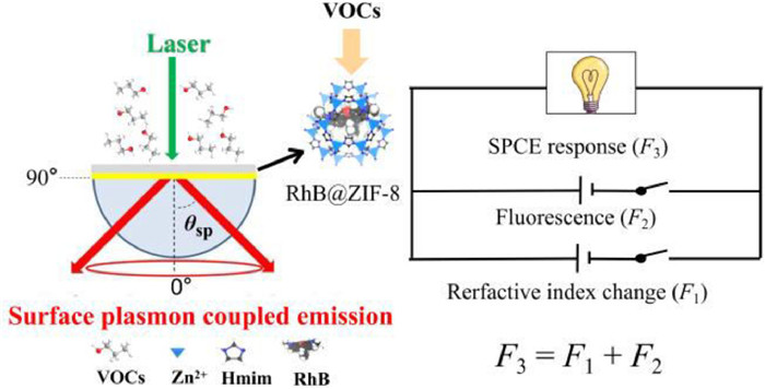 In summary, we have developed a multi-information acquisition sensing strategy that can monitor simultaneously refractive index and fluorescence properties on the surface by a single fluorescence signal measurement. The dye@MOF based SPCE sensor was established with high sensing performance. The SPCE sensor monitored the changes of fluorescence property and refractive index of RhB@ZIF-8 simultaneously when adsorbing VOCs, and the SPCE sensor was able to amplify the response by parallelizing the signal variations caused by both. In the future, it is expected to introduce dielectric layers with different refractive index to achieve fluorescence encoding mediated by different emission angles or polarization. Cross-validation and complementation of multiple information can provide a reliable study on the interface. Achieving synchronicity in real time is essential for advancing the study of relevant chemical events on the interface. This all-in-one method offers new opportunities for monitoring chemical and physical phenomena on the interface including chemical sensing, biosensing, and nanotechnology.