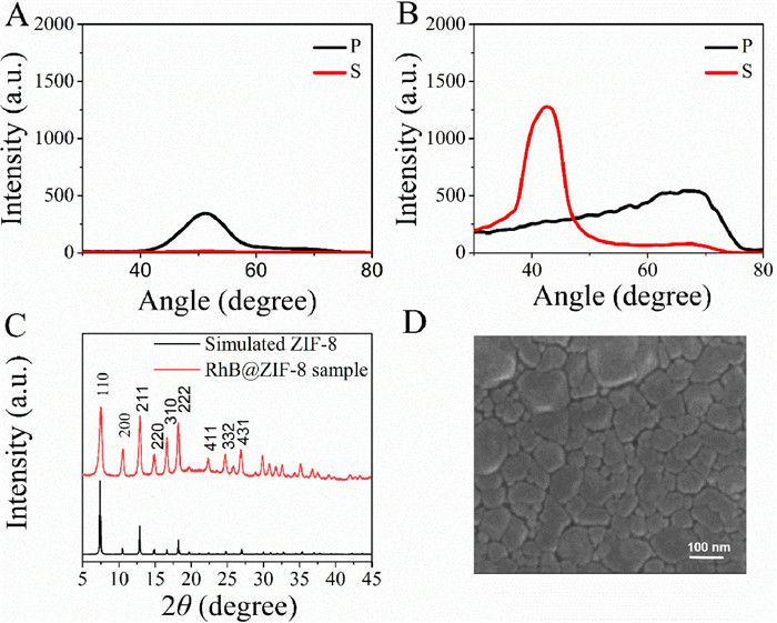 | Fig. 2. (A) Angle distribution pattern of RhB@ZIF-8 film grown for one cycle. (B) Angle distribution pattern of RhB@ZIF-8 film grown for three cycles. (C) XRD of RhB@ZIF-8 materials and the simulated one. (D) SEM of RhB@ZIF-8 film grown for three cycles. | |