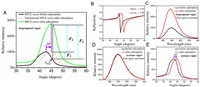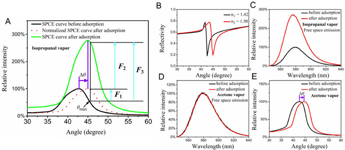 | Fig. 3. Mechanism of the RhB@ZIF-8 based SPCE sensor to monitor the adsorption of VOCs. (A) Change of angle distribution pattern recorded at 579 nm light before and after adsorption of saturated isopropanol vapor. (B) Theoretical simulation by Fresnel calculations before and after adsorption of saturated isopropanol vapor. The free space emission spectrum of RhB@ZIF-8 materials before and after adsorption of (C) saturated isopropanol vapor and (D) saturated acetone vapor. (E) Change of angle distribution pattern recorded at 579 nm light before and after adsorption of saturated acetone vapor. | |